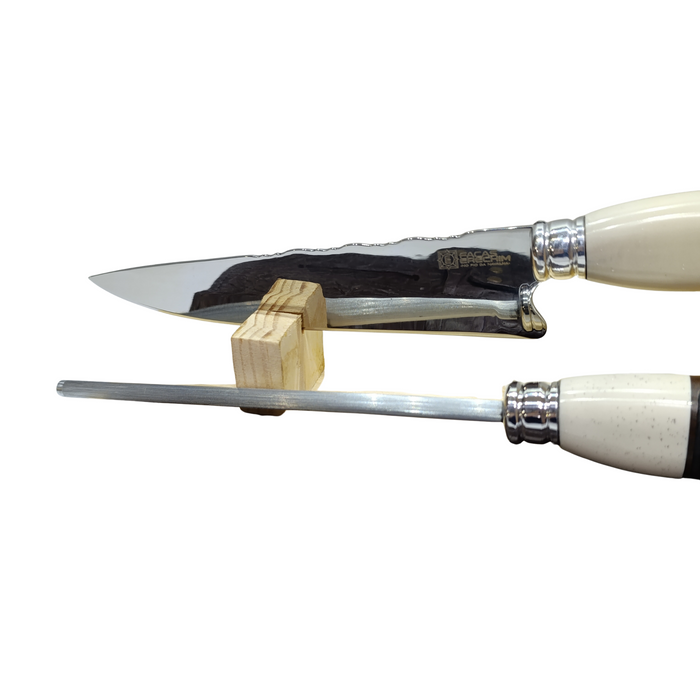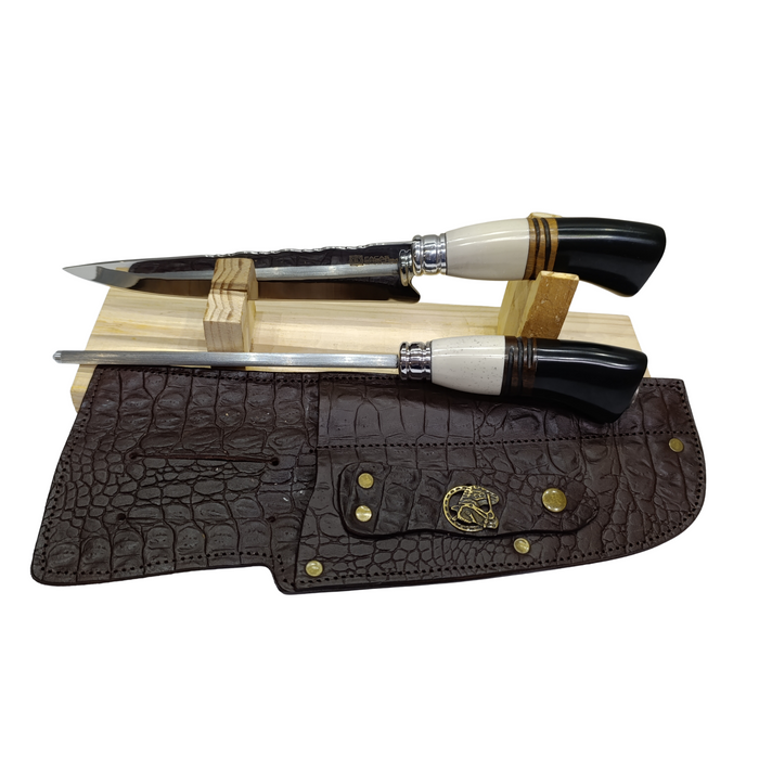 A chaira estriada, também em aço inox 420, é ideal para alinhar e manter o fio da lâmina sempre afiado, prolongando a vida útil da faca e assegurando cortes eficientes a cada uso. O cabo em madeira, osso e chifre bovino sintético confere acabamento robusto, elegante e com excelente pegada.