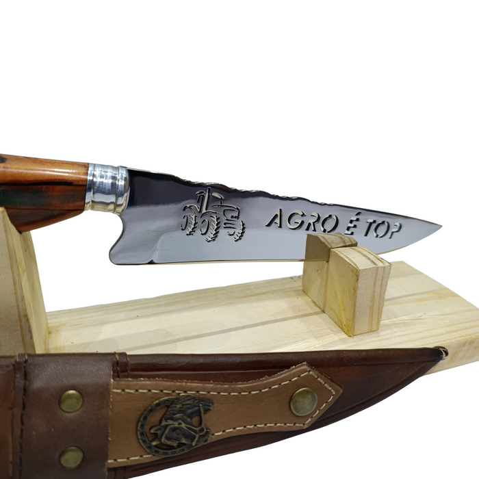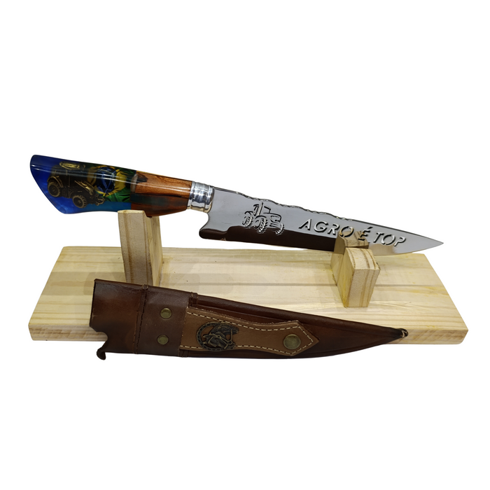 O grande destaque está no visual exclusivo: a lâmina traz desenho de trator e a frase “Agro é Top” vazados, reforçando a força e o orgulho do agronegócio. O cabo em madeira e resina é uma verdadeira obra de arte, com trator em bronze e a bandeira do Brasil ao fundo, criando um acabamento imponente, patriota e cheio de personalidade. Acompanha bainha em couro, garantindo proteção, praticidade e sofisticação no transporte.