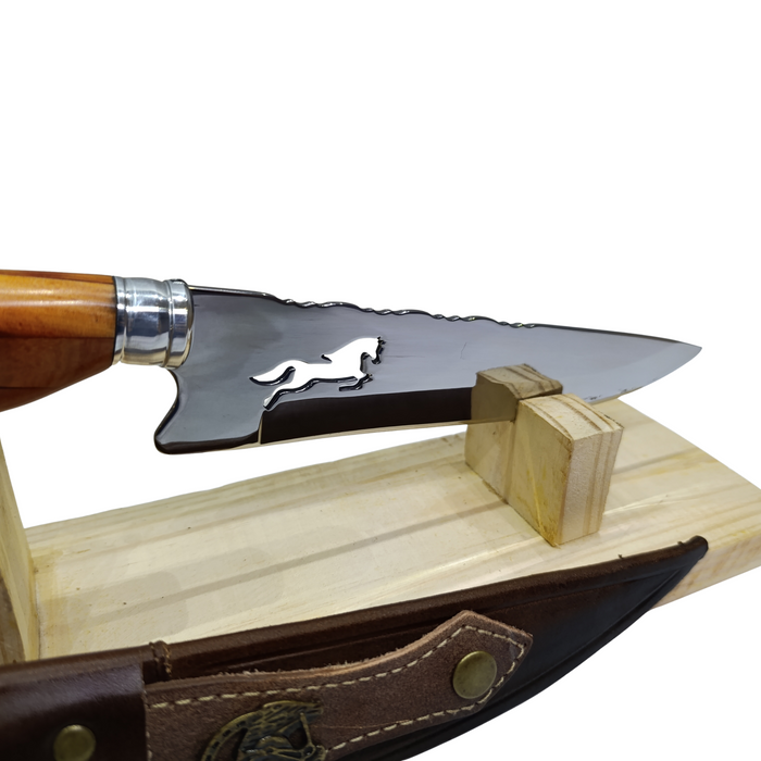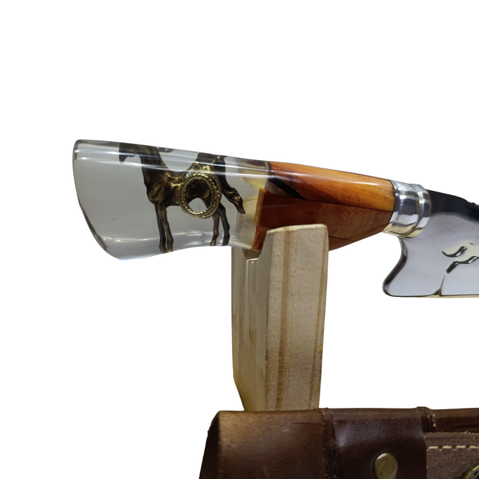 O grande diferencial está no design exclusivo e marcante: a lâmina traz desenho de cavalo vazado, simbolizando força, liberdade e nobreza. O cabo em madeira e resina recebe um acabamento artístico com um cavalo em bronze aplicado na resina, transformando cada peça em uma verdadeira obra de arte. Acompanha bainha em couro, garantindo proteção, praticidade e sofisticação no transporte.