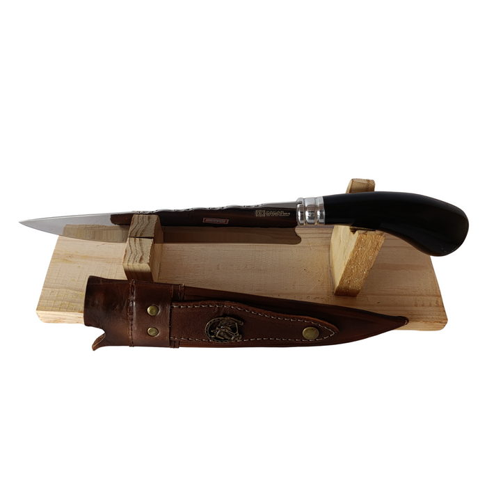 O cabo em chifre bovino sintético confere um visual tradicional e imponente, além de ótima ergonomia e pegada firme, valorizando o acabamento artesanal da peça. A faca acompanha bainha em couro, garantindo proteção, praticidade e sofisticação no transporte e armazenamento.