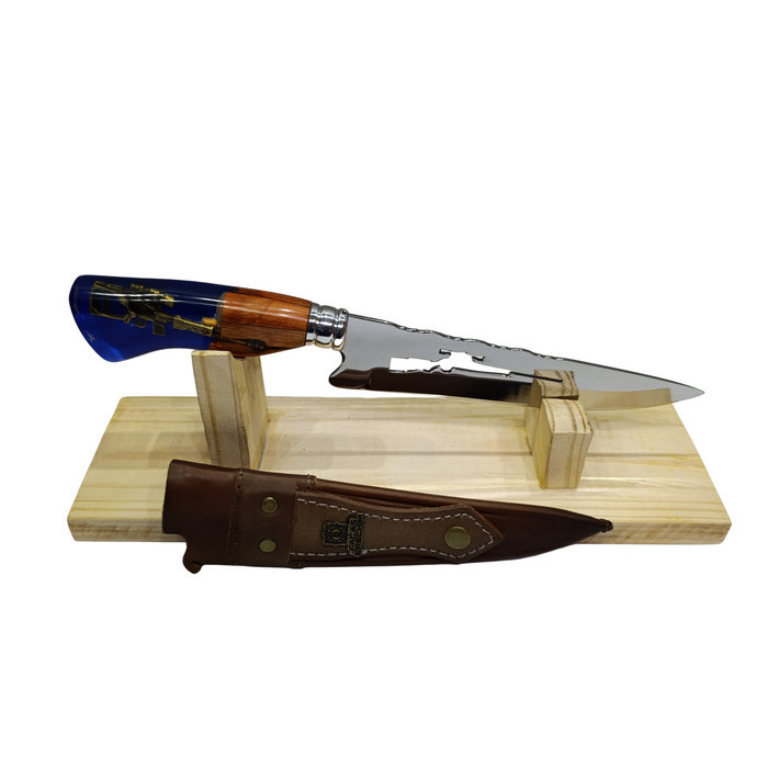 O grande destaque fica por conta do design exclusivo: a lâmina possui imitação de fuzil vazado, e o cabo em madeira e resina traz detalhe interno com imitação de fuzil, resultando em um visual ousado, moderno e diferenciado. A faca acompanha bainha em couro, ideal para proteger a lâmina e facilitar o transporte com segurança e estilo.