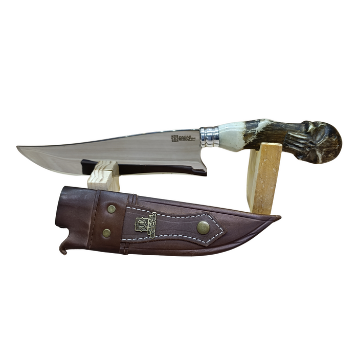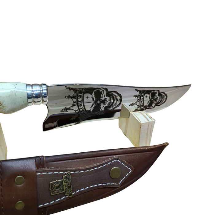 O cabo em resina com desenho de caveira proporciona pegada firme, ergonomia e um acabamento exclusivo que reforça a personalidade da peça. Acompanha bainha em couro, assegurando proteção da lâmina, transporte seguro e acabamento à altura da faca.