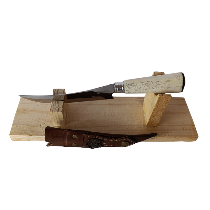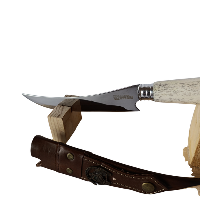 O cabo em osso bovino sintético traz um visual clássico e sofisticado, além de ótima ergonomia e firmeza na pegada, valorizando o acabamento artesanal da peça. A faca acompanha bainha em couro, garantindo proteção, praticidade e elegância no transporte e armazenamento.