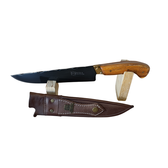 O cabo em madeira nobre oferece pegada firme, ergonomia e acabamento sofisticado, valorizando ainda mais a peça. Acompanha bainha em couro, garantindo proteção da lâmina, transporte seguro e um visual à altura da faca.