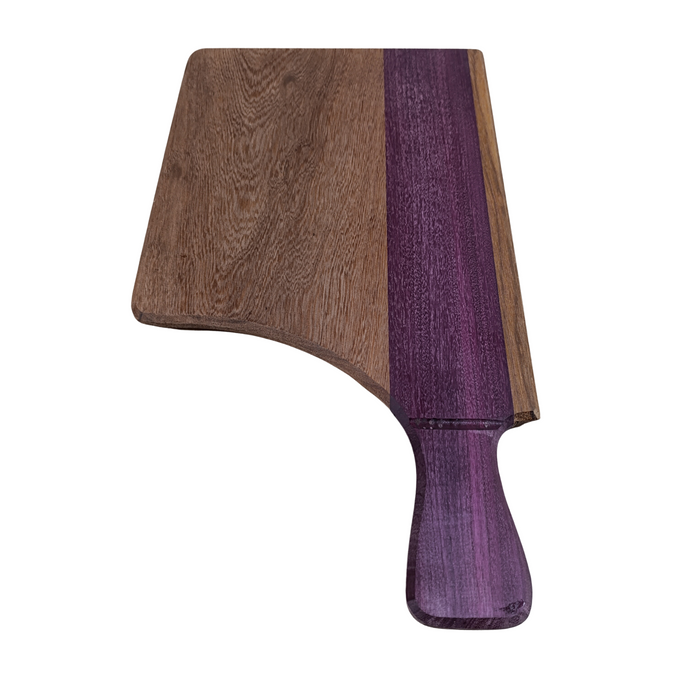 Produzida com a combinação de cedro, conhecido pela leveza e tonalidade quente, e roxinho, uma madeira nobre de coloração intensa e sofisticada, essa tábua se destaca pelo contraste marcante e acabamento premium. Cada peça é única, revelando a beleza natural e a harmonia entre as madeiras.